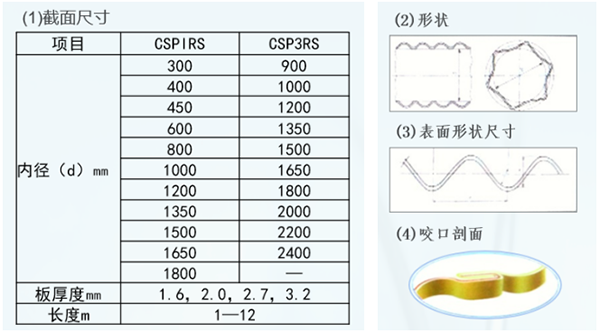 我公司生产的螺旋肋镀锌波纹钢管,采用独特的翻边压肋、滚压咬口工艺。在产品咬口处形成4倍于板材厚度的连续螺旋加强肋,既降低了产品重量又极大地提高了产品的刚性、柔性、抗拉和抗压强度。产品抗压强度是塑料管的3倍,是水泥管的1.5倍。